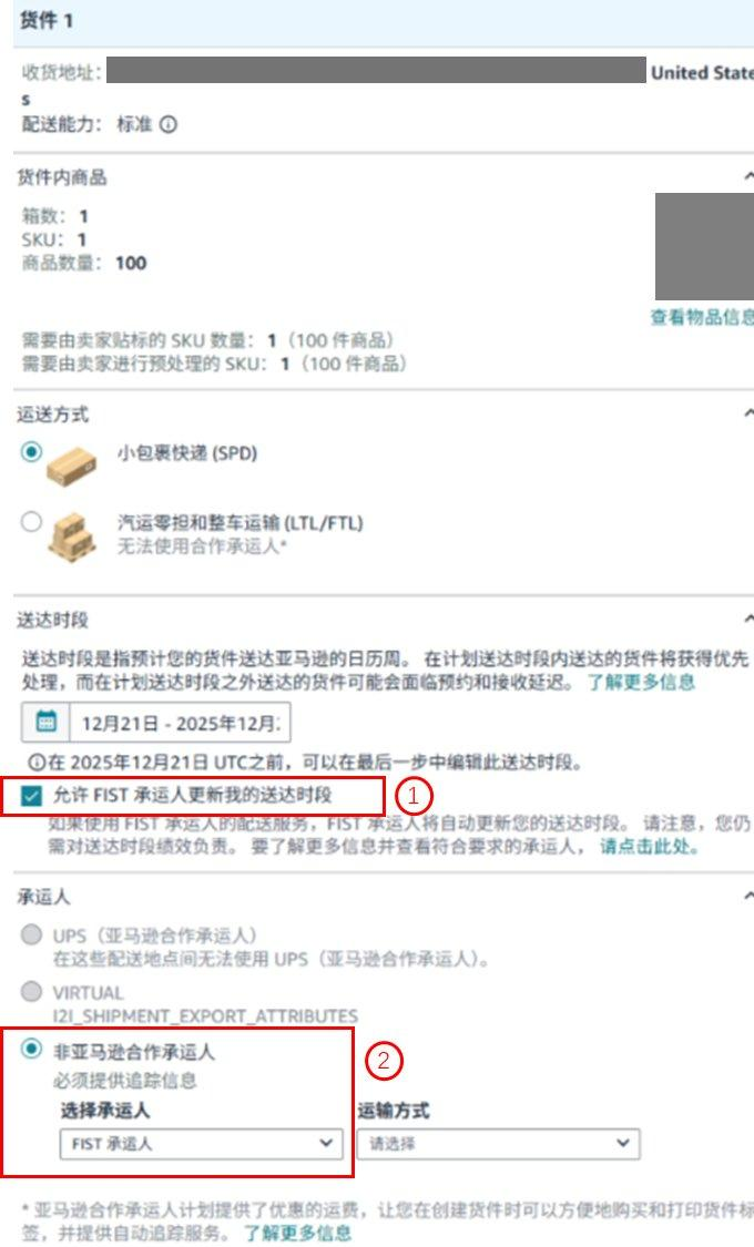 3. 同样在第 2 步中,确保 ① 【送达时段】内默认勾选【允许FIST 承运人更新我的送达时间】。同时在② 【承运人】处,保持默认【非亚马逊合作承运人】-【FIST 承运人】勾选,请勿修改。注意两处勾选缺一不可。